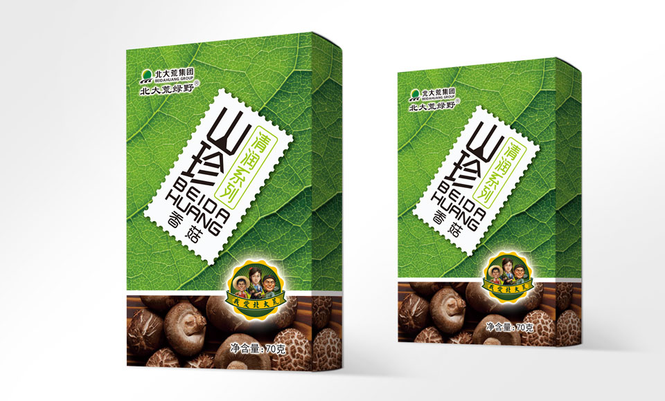 使用了绿叶作为大面积运用,构成有力的符号记忆。这种表现手法在同类山珍领域里,北大荒集团是第一家启用这种包装设计表现手法,所以能够和同类产品脱颖而出,让消费者在购买第一次后便可记住这款产品。