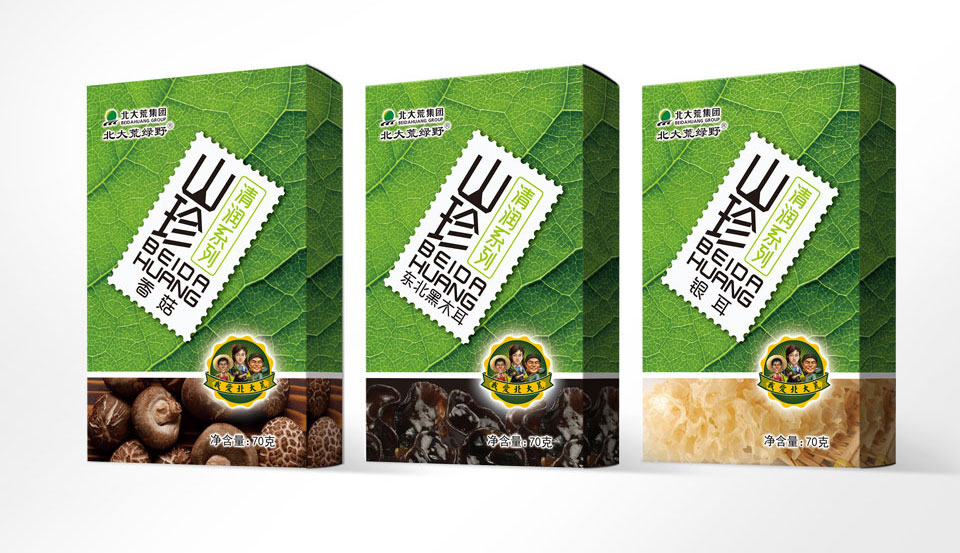 北大荒集团委托狗子28设计完成山珍系列产品包装规划及设计,项目服务内容:1.东北黑木耳包装设计,2.香菇食材包装设计,3.银耳食材包装设计,4.礼盒包装设计。