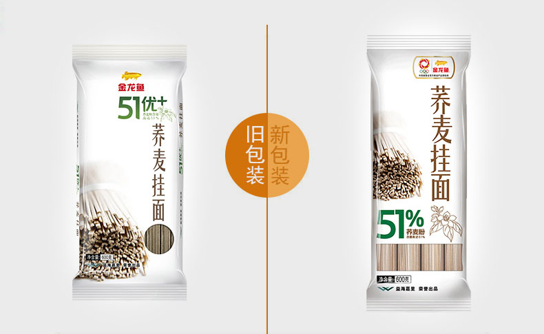 我叫金龙鱼,但是这里没有强化金龙鱼的品牌效应,是因为金龙鱼只是作为产品的背书存在,真正要表达的是这个产品。整个理念设计逻辑是:这是荞麦挂面,然后才让你知道这是金龙鱼的挂面。