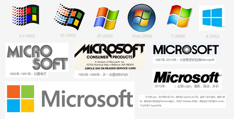 不管是交互方式、视觉设计或是价格策略方面,微软对于Window 8的“重新构想”一直是非常基础的 ,但是,微软最新操作系统有一个方面实际上受到了其过去历史的启发,那就是Window的标志(LOGO)。从外形上来说,微软2月份推出的二维地铁风格Windows标志最为接近微软最初的视窗操作系统LOGO,这一最新LOGO将在Windows 8与Windows Phone 8操作系统中使用。2012年与1985年的LOGO均避开了渐变以及其他颜色,外表为中性蓝色。