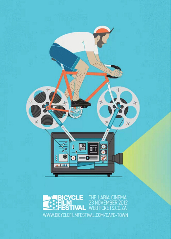 二逼青年欢乐多,请尽情玩转海报关键词,使用出人意料的图片,当然,主题内容正式除外。下方的单车电影节海报大可选用各类其它或活泼或新奇的风格,但设计师选用了幽默法来表达,这不禁让读者们心里长草,去要一探究竟。