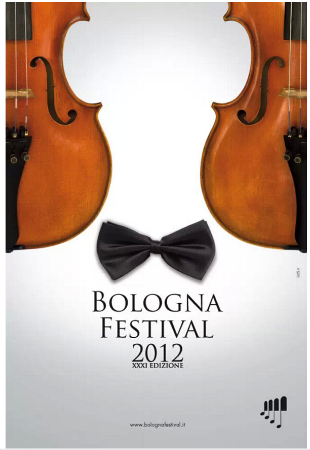 尝试怪异的颜色或独特的图片,抑或与众不同的字体;将对比强烈的图片放在一起,或将文字和图片组合成另一个物体……下方的博洛尼亚音乐节海报就是个很好的例子——你是先看见了小提琴还是佩戴领结的男士呢?