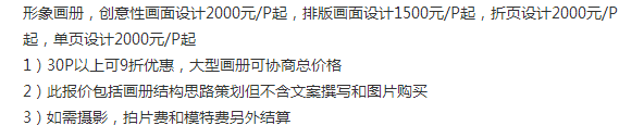 今天不小心去试问了下同行的设计价格,狗子28 做画册,500元1p,以为很高了,有些客户也觉得是天价了,我问下上海的一家公司,说实在的也不咋地(不是不好,只是也很普通),具体哪家就不好意思说了,自己网上查,上面有人家的报价单,下面是人家的一个报价单:说实在的我觉得不高,但是比狗子28 起来就觉得自己不如人家了。