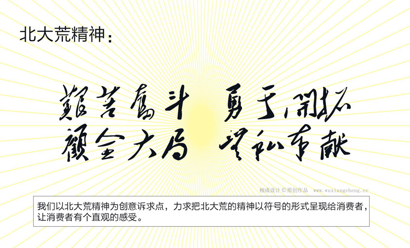 一个有故事的品牌首先要让消费者知道这个故事的背后情感。这里面相成品牌设计通过对北大荒文化背景的深挖。加上与客户的思想沟通。相成品牌设计最后把这个故事的方向定在了北大荒的拓展情怀上。当初的北大荒成为了如今的北大仓。这里面含有那些故事精神?
